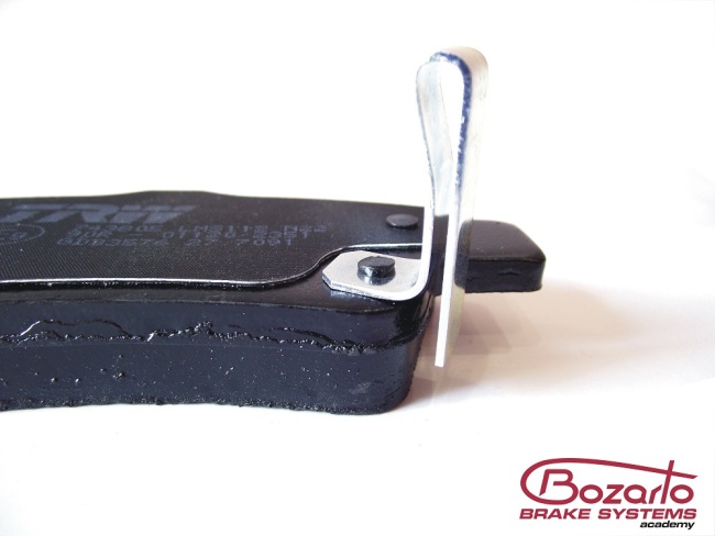 Akustyczny czujnik zużycia jest czysto mechaniczny i ma postać blaszki ciernej zamontowanej do blachy nośnej klocka hamulcowego. Po osiągnięciu granicznej grubości klocka tarcza hamulcowa styka się z blaszką cierną podczas uruchamiania hamulca. Połączenie tego kontaktu i obracania się tarczy hamulcowej generuje nieprzyjemny, charakterystyczny pisk.