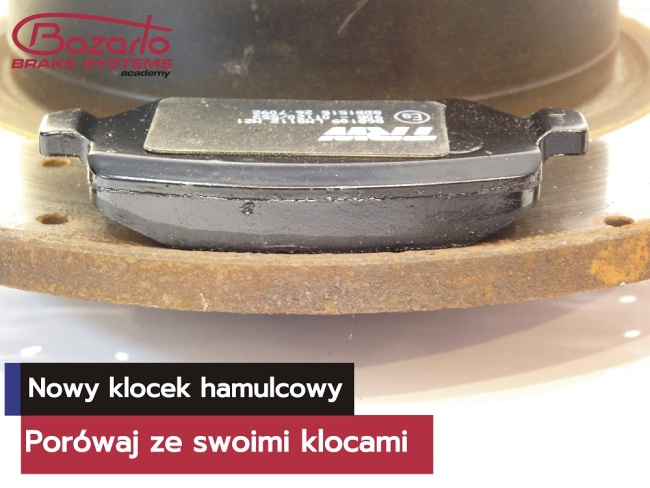Istotna jest grubość masy ciernej. Jeśli oba elementy klocka są podobnej grubości jest to znak, że wkrótce należy przygotować się do wymiany klocków hamulcowych.