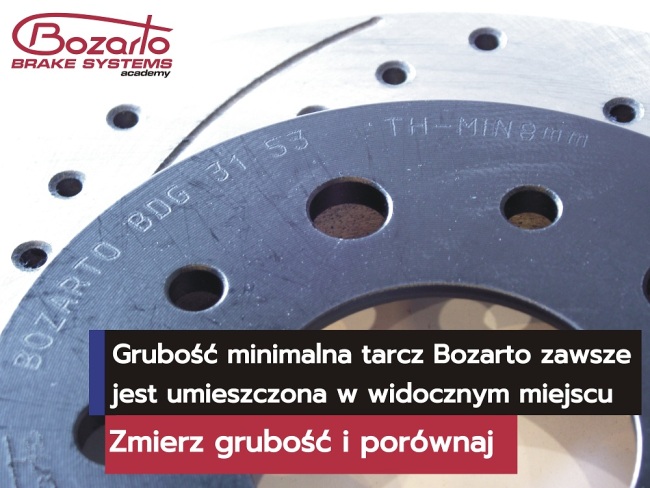 Grubość minimalna tarcz Bozarto jest zawsze umieszczona na tarczy, łatwo ją odnajdziesz po zdjęciu koła. Określa ją PRODUCENT pojazdu.