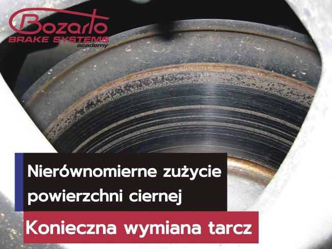Cała szerokość masy ciernej klocka musi stykać się z tarczą, nie mogą występować zardzewiałe pierścienie jak poniżej.